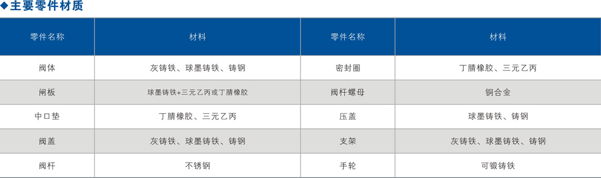 ②闸板设计:闸板采用球墨铸铁件外全覆无毒丁晴橡胶或者三元乙丙橡胶。